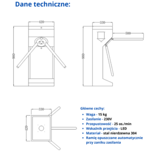 Bezobsługowość - w przypadku zaniku zasilania nie ma potrzeby ręcznego udrażniania przejścia - urządzenie samoczynnie opuści ramię umożliwiając swobodne przejście.